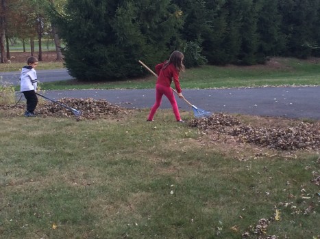 And so, my mind and my heart were a bit of a mess this afternoon, when the kids asked permission to go outside after the film. We took our big bucket of chalk out to our ample driveway to draw pictures and little messages of love. Then the mess of leaves strewn across our yard challenged an attack. So, we took up rakes and sallied forth to do battle. We conquered one small corner, and then conceded some of the hard-fought ground to celebratory pile-jumping and complicated maneuvers involving the red wagon as a transport device ill-equipped to move children and leaves in the same load.